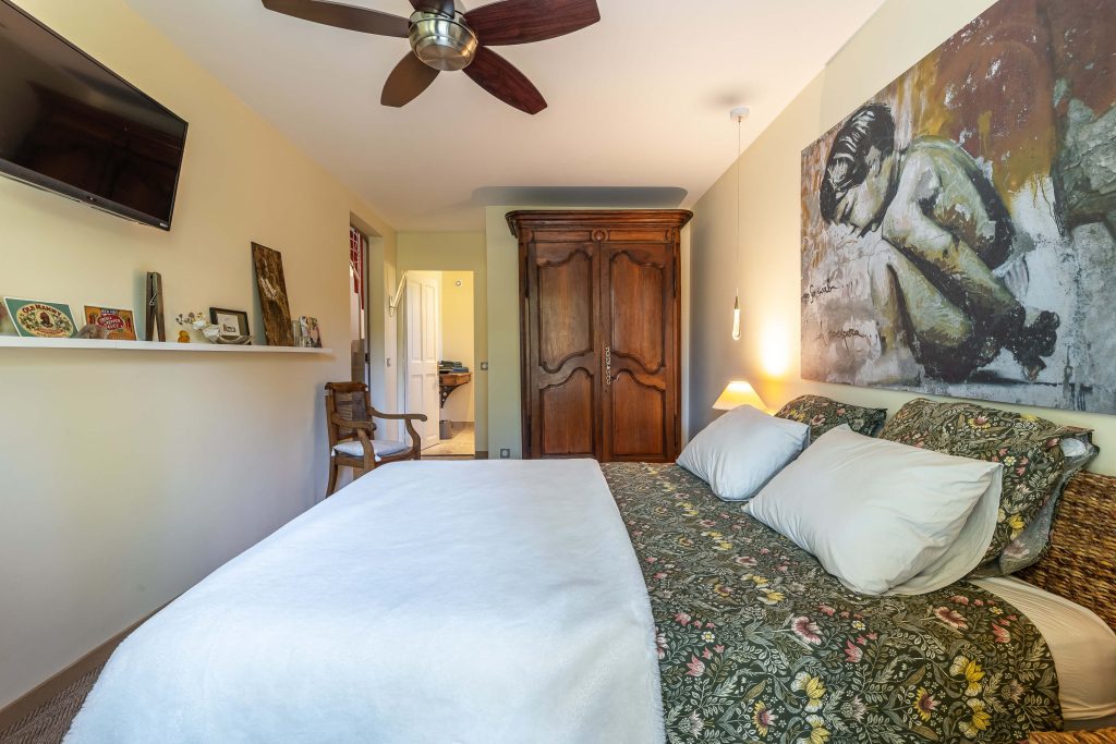 Lit 160×200 Salle de bain indépendante (douche) WC indépendant Linge de lit / de bain / peignoirs Sèche-cheveux Rangements TV Ventilateur plafond
